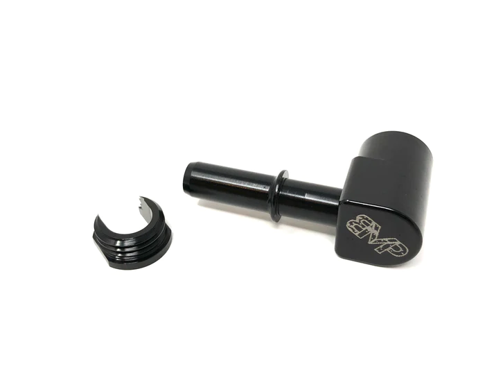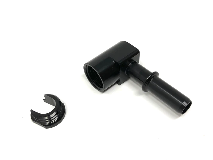 The Black Market Parts 7.89mm QUICK CONNECT FITTING FOR WALBRO PUMPS provides a solid leak free method to connect a barbed Walbro fuel pump to OEM 7.89mm female quick connect fittings. It features easy to install fitting and locking ring to ensure positive seal against the viton o-ring inside the fitting. The fitting itself is made from 6061 aluminum which is cnc machined and anodized black to ensure 100% E85 compatibility.