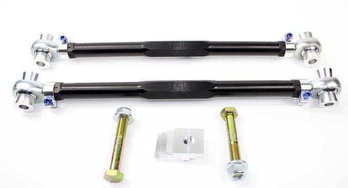 BMW E9X Rear Toe Arms (RTA) for BMW E8X/E9X non M Version increase stability and response by eliminating bushing deflection while providing an increased range of rear toe adjustment, necessary for lowered cars or for performance alignments.  Even small changes to ride height and camber will affect toe settings, and the wide range of adjustment allows you to maximize grip on a track car and extend tire life on a street car.  The factory rear toe arms utilize an eccentric bolt and washer for adjustment and lack the precision and range that SPL Parts rear toe links offer.  Black Anodized and gun drilled 2024 Aluminum main links along with our 360 degree Rotating Clamp design allow for quick and precise adjustment. The Rotating Clamps are tightened with Blue Anodized Titanium Socket Head Cap Screws for easy to access adjustment, and shaves even more unsprung weight, without compromising strength.