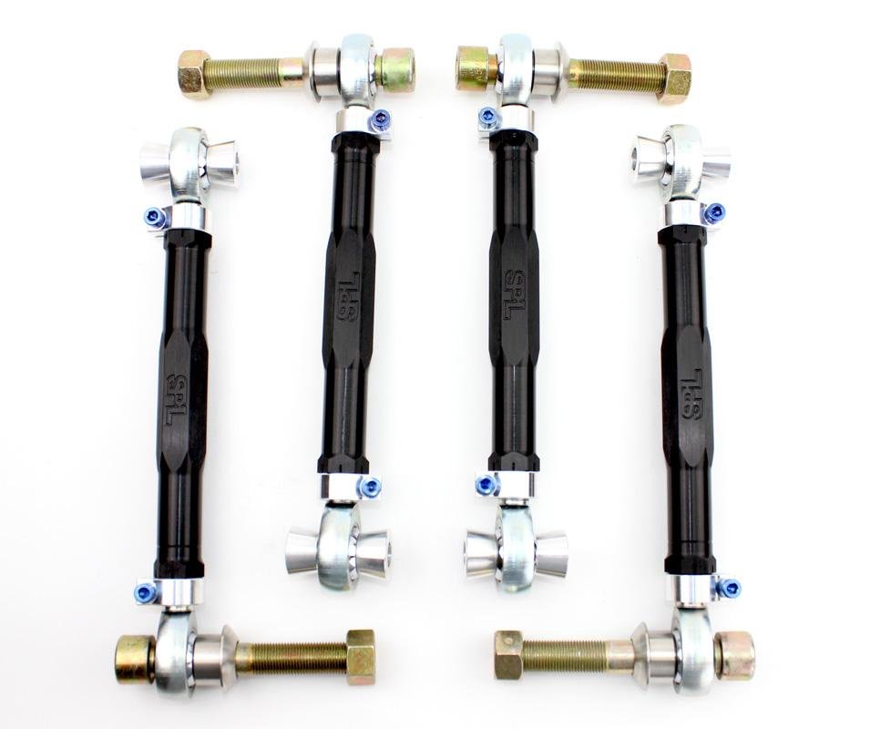 BMW F8X adjustable Rear Upper Arms (RUA) are an absolute necessity to maintain proper rear camber and reduce tire wear on the street and track. The stock BMW setup has an aggressive camber curve through bump travel, which is very apparent on lowered cars. Excess negative camber causes premature tire wear on the inside edge, and reduced traction on acceleration while too little camber will limit rear grip while cornering. Our Rear Upper Arms provide a wide adjustment range for precise rear camber alignment that is easily optimized for street or track driving while eliminating bushing deflection with smooth articulating Teflon lined rod ends in place of the soft factory rubber bushings. Our kit replaces the factory links commonly referred to as the rear wishbone and rear guide links.